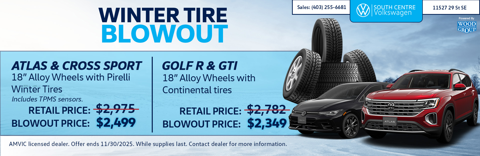 *AMVIC licensed dealer. Pricing plus GST. Offer available while supplies last. Packages include 18” alloy wheels with corresponding winter tires as listed; TPMS sensors included only with Atlas & Cross Sport packages. Tire brands, wheel styles, and availability may vary by model year. Installation not included unless otherwise stated. Offer ends 11/30/2025. Contact dealer for complete details.