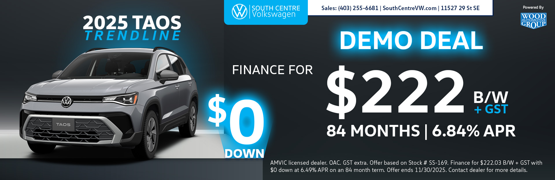 *AMVIC licensed dealer. OAC. GST extra. Offer based on Stock # SS-169. Finance for $222.03 bi-weekly plus GST with $0 down at 6.49% APR on an 84-month term. Payment includes no additional dealer-installed accessories. Rates shown are subject to change without notice. All financing is subject to approved credit and may vary depending on the applicant. Vehicle may be a demo model and may include mileage. Offer available until 11/30/2025. Contact dealer for complete details.